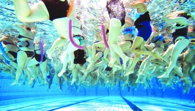 “美腿”林立池中 当地时间6月30日,瑞士西部尼翁,露天泳池中举办的大型水中健身操活动。 |
