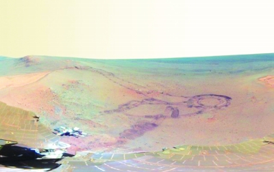 火星发来照片 美国宇航局(NASA)日前公布了一组火星漫游器“机遇号”在火星表面拍的高清广角图片。面对这些由多张照片组合而成的广幅照,观众似乎亲身坐在“机遇号”顶部,放眼可以眺望火星表面火红土壤的高低起伏,低头则可以打量“机遇号”如外星飞行物般的太阳能电板的复杂构造,极为壮观。在成功登上月球后,人类便将火星当成向其它星体探索的重要一站。 |