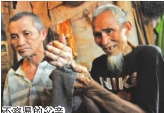 贵州凯里93岁的老人寥永光在家打扫劳动,照顾60岁瘫痪的儿子寥志武。寥志武是凯里开发区清水江畔和平村苗寨二组村民,2008年赶牛回家时摔倒造成半身瘫痪,病后花光了家里的积蓄,还背上了几万块的外债,寥志武至今仍卧病家中,大小便不能自理。