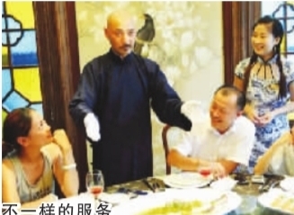 为使前来就餐的民众有一种身临其境的感觉,南京1912街区民都荟民国菜馆请来特型演员,加盟到服务者行列。这是8月6日,扮演成“蒋介石”的特型演员在给前来就餐的食客们介绍民国菜肴特色。