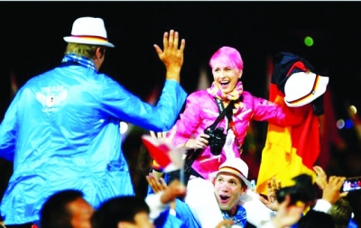 不一样的入场 伦敦奥运会闭幕式上,各国运动员入场方式与往届完全不同,他们从观众席的四面八方走向中心场地,这可以说是伦敦的一大创意。没有传统的走入,而是更加亲民的与观众为伴,从观众席走下来的运动员不断与观众打招呼握手,进而走到属于自己国家的位置上。 |