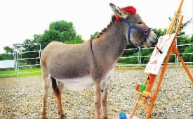 不一样的驴子 英国布里斯托尔一只名叫Patty的驴子堪称动物界的“毕加索”,这只可爱的小家伙颇具艺术天分,竟然会用画笔作画。它戴着红色的贝雷帽,用嘴咬着画笔,开始挥毫作画,整个动作一气呵成,仅仅用了10分钟就完成了画作,它的作品色彩鲜明,一本作品集可售价达到100英镑。 |