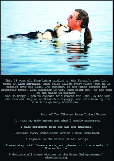 不一样的结局 19岁的老狗Shep 患有关节炎,常常脚痛得寝食难安。他的主人John每天在睡前抱他到苏必利尔湖(Lake Superior)中,用水疗的方式舒缓关节疼痛与不适的感觉。这个季节的水温非常温暖,拍摄照片的时候,Shep在主人怀里睡着了,看起来非常祥和。狗的寿命大多为15年左右,少数犬种可活到20年以上。虽然生病很痛苦,但是能有主人的照顾及陪伴到终老,是非常幸福的。同样是狗,有的却被吃掉…… |