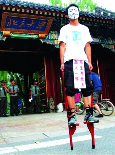 不一样的待遇 一副高跷,一张面具,一块写着“京生考北大高人一等”的塑料板。8月5日下午,90后河南小伙程帅帅靠着这简单的“装备”,在北大门口上演了一场“行为艺术”,表达自己对高考户籍歧视的不满。程帅帅认为,“北大在河南、山东、四川、安徽、湖北、河北6省的招生总数不及北京一地,而河南等6省总计报名参加高考人数332.13万人,为北京市的45.5倍。这太不公平了,北大不能把自己办成北京人的大学啊!” |