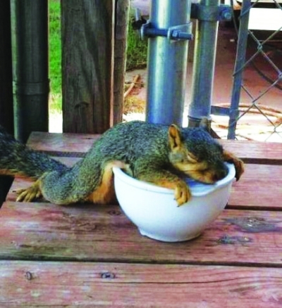 小松鼠卧冰解暑 日前,美国俄克拉荷马州,气温直逼华氏115度(约摄氏46.1度)。一名好心民众端出一碗冰,希望能让一只松鼠清凉一下,没想到这只松鼠竟然上半身整个趴在冰上……我们有冷气可以吹,有冷饮可以消暑,但动物乘凉的地方如树下、河流,不是被砍伐就是被污染了,如果说人类为全球热浪所苦,动物们的苦热更是无处宣泄了。 |