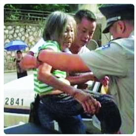当街毒打亲生母 8月31日下午五点半,在南京燕子矶江边路,一个三十多岁男子毒打八十多岁老母亲,边打边将老人家拖行500多米。该男子还对周围人叫嚣:“我打的是我妈,关你什么事情。”一位愤怒的车主下车将男子痛揍一顿,其他市民将老太太扶起,老太太浑身伤痕触目惊心。图为民警抬被儿子毒打的老人上车送医院检查。 |