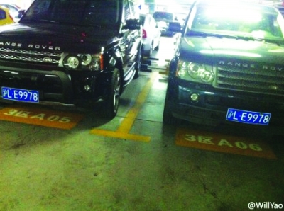 真假车牌面对面 上海新天地的停车场,围了一堆警察,套牌车跟牌照持有车停在一起,人家直接就报警了。这也太巧了。 |