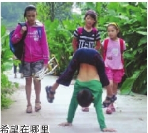 希望在哪里 因患小儿麻痹症,宜宾10岁的颜玉宏艰难地倒立行走。手磨痛了套鞋走、爬着走、拄着拐杖走,实在走不动了才让奶奶背……每天要咬牙坚持3个多小时,才能“走”完上学路,不管刮风下雨,他已经坚持了4年多。是什么让他如此执着?“我要好好读书,读书是我的理想,将来才能报答奶奶。”他的辛酸,他的努力,经媒体报道后,让广大读者为之感动。 |