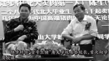 陈生是广东省湛江市人,1980年考入北京大学经济系。毕业后,他搞过房地产、卖过饮料,后来又瞄上了据他说绝不少于1万亿市场的猪肉生意。2009年,陈生把老陆请到广州,一起商量开“屠夫学校”培养高级屠夫的事,陈生请老陆编写教材。“杀猪的没文化,有文化的没杀过猪,这事由我来干最合适!”老陆一口答应下来。4个月后,他写出了中国第一本屠夫教材——《猪肉营销学》。