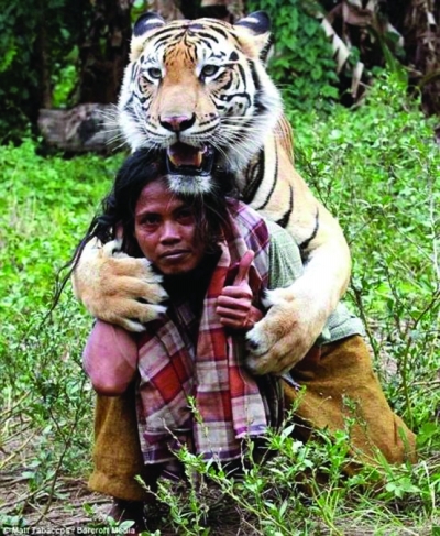 奇人 据英国《太阳报》报道,印度尼西亚爪哇岛东部玛琅市的一名无所畏惧的男子阿卜杜拉·索勒将一头名叫“木兰”的雌虎从小养到4岁。在这4年中,他们形影不离,一起拥抱、玩耍、模拟打斗,索勒甚至经常放弃自己的舒适卧室,和“木兰”睡在一座摇晃的外屋里。如今,这头老虎已经重达378磅(约合343斤),十分健康。阿卜杜拉也因此被亲切地称为“老虎奶妈”。 |