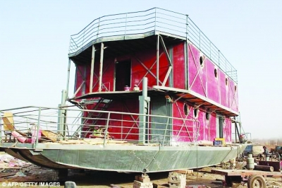 奇船 “我怕2012年世界末日来临,洪水淹没我家,所以把家中所有积蓄拿出来制造了这艘船,到时候大家可以在船上避难。”新疆生产建设兵团农一师塔里木河南岸农业连队的陆政海说。据介绍,这艘相当于内陆河道中型舰船的大船,设计总长21.2米,宽15.5米,高5.6米,三台柴油发动机总动力与540匹马力相当,排水量140吨,全部由个人独立设计和制造,下水后将成为塔里木河流域最大的船。但其比例并不太符合《圣经》关于诺亚方舟的描述。 |