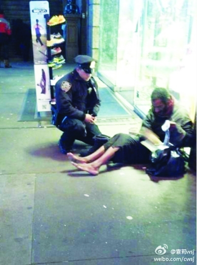 奇情 一位纽约警察给时代广场的光脚流浪汉买鞋穿鞋的照片在网上流传。这位警察执勤时看到寒夜里坐在地上的流浪汉,聊天问了鞋号,然后给他买了双靴子。一位游客正好拍下这一幕并贴到网上。目前,这张照片被浏览160多万次。这种事在哪里可能都不多见,但寒冬中有这么一幕总是暖人心。 |